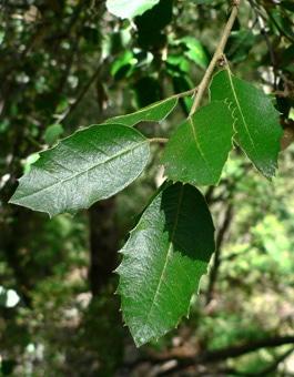 An evergreen tree with a rounded, dense crown, it may also be a low shrub in dry, open habitats. The mature bark is gray and scaly. Leaves are oblong to elliptic, 1 to 1 ½ inches long, flat, firm and toothed at themargins. With older trees the leaves appear smoother.