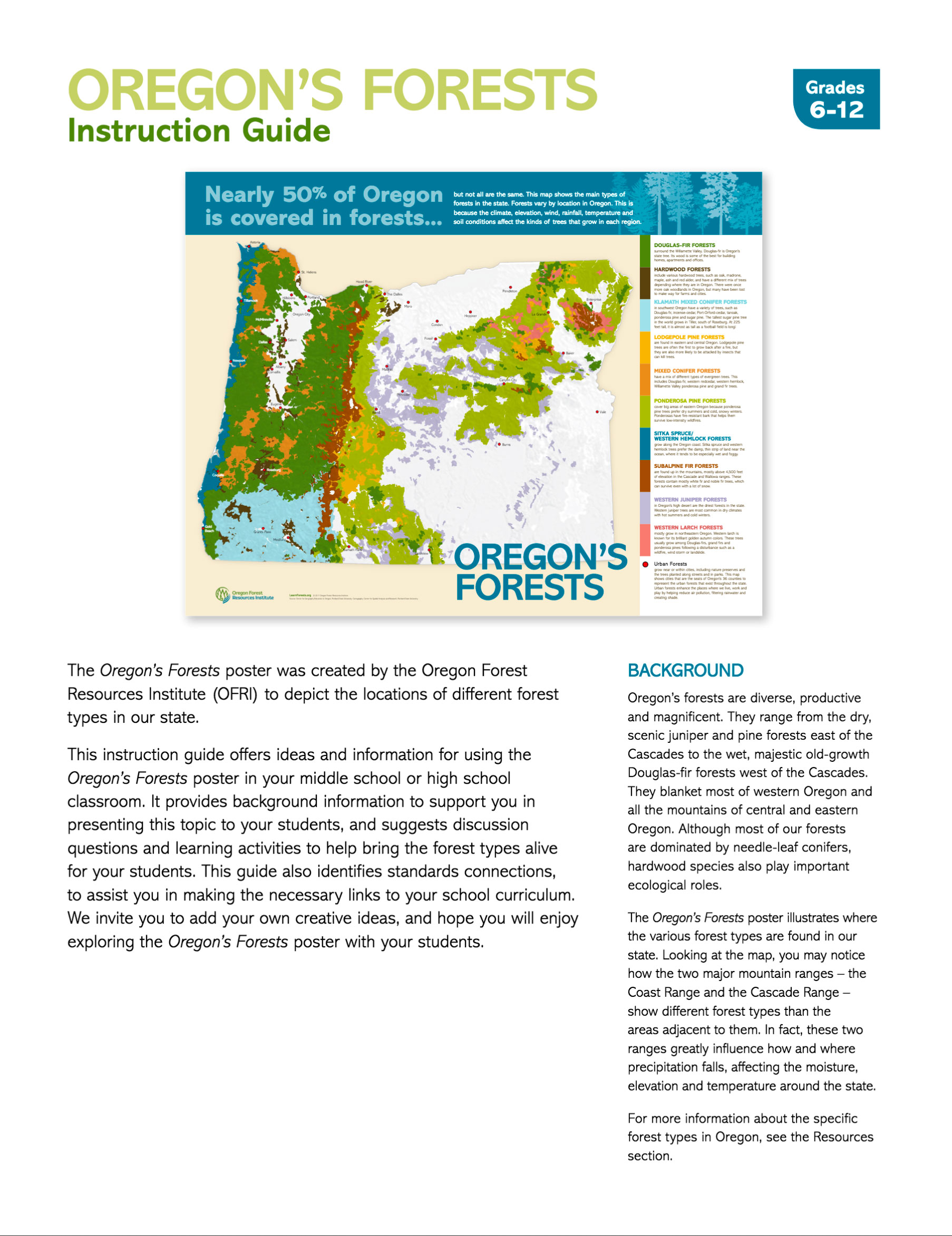 A companion to Oregon's Forests poster, the Instruction Guide includes additional activities, lesson plans and background information to help teachers go deeper into the material included in the student publication. The guide also includes a list of additional resources, and it is aligned to state educational standards.